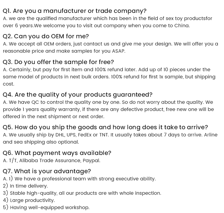 Our company integrates R&D design, production and sales. We specialize in manufacturing exquisite sex toys, such as remote control vibrating eggs, external massagers, double-action vibrators, G-spot vibrators, rabbit vibrators etc. OEM and ODM services are both available.